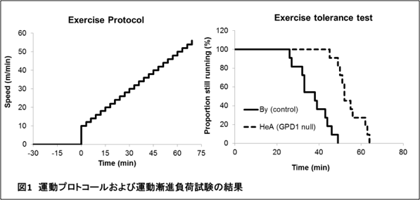 短距離走のような高強度運動において、ATP産生は解糖系による嫌気的代謝に依存する。解糖系ではNAD⁺を補酵素として利用する代謝反応が存在する。NAD⁺の供給にはいくつかのシャトルが関与し、その一つにグリセロールリン酸シャトルがある。これまでに、グリセロールリン酸シャトルに関わる酵素であるglycerol-3-phosphate dehydrogenase (GPD)1を欠損させたマウスに運動をさせると、解糖中間代謝産物が蓄積し、さらに筋肉でのATP量が低下することが明らかにされている。この結果からGPD1欠損によるグリセロールリン酸シャトルの阻害は解糖系およびATP産生に異常を引き起こし、運動機能を低下させる可能性がある。今回の実験では、GPD1の運動能力への影響を明らかにし、運動時のATP産生におけるグリセロールリン酸シャトルの寄与を推察することを目的とした。GPD1の自然欠損モデルであるBALBc/HeAマウス(HeAマウス)に運動漸進負荷試験を行い、運動持久力を調べた(図1)。同時に運動時の酸素消費量と二酸化炭素排泄量を測定・分析した。コントロール群にはBALBc/Byマウス(Byマウス)を用いた。運動持久力および最大酸素摂取量はByマウスに比し、HeAマウスで向上しており、運動時の脂質酸化量はHeAマウスで有意に高かった。一方、運動時の糖質酸化量は、Byマウスで有意に高かった。以上の結果より、GPD1の欠損は運動時の脂質酸化量を増加させて運動持久力を向上させることが明らかになった。また、GPD1欠損による糖質代謝異常は、骨格筋の脂質利用率を向上させるような適応反応を引き起こしている可能性が示唆された(Biochem. Biophys. Res. Commun. 2015)。